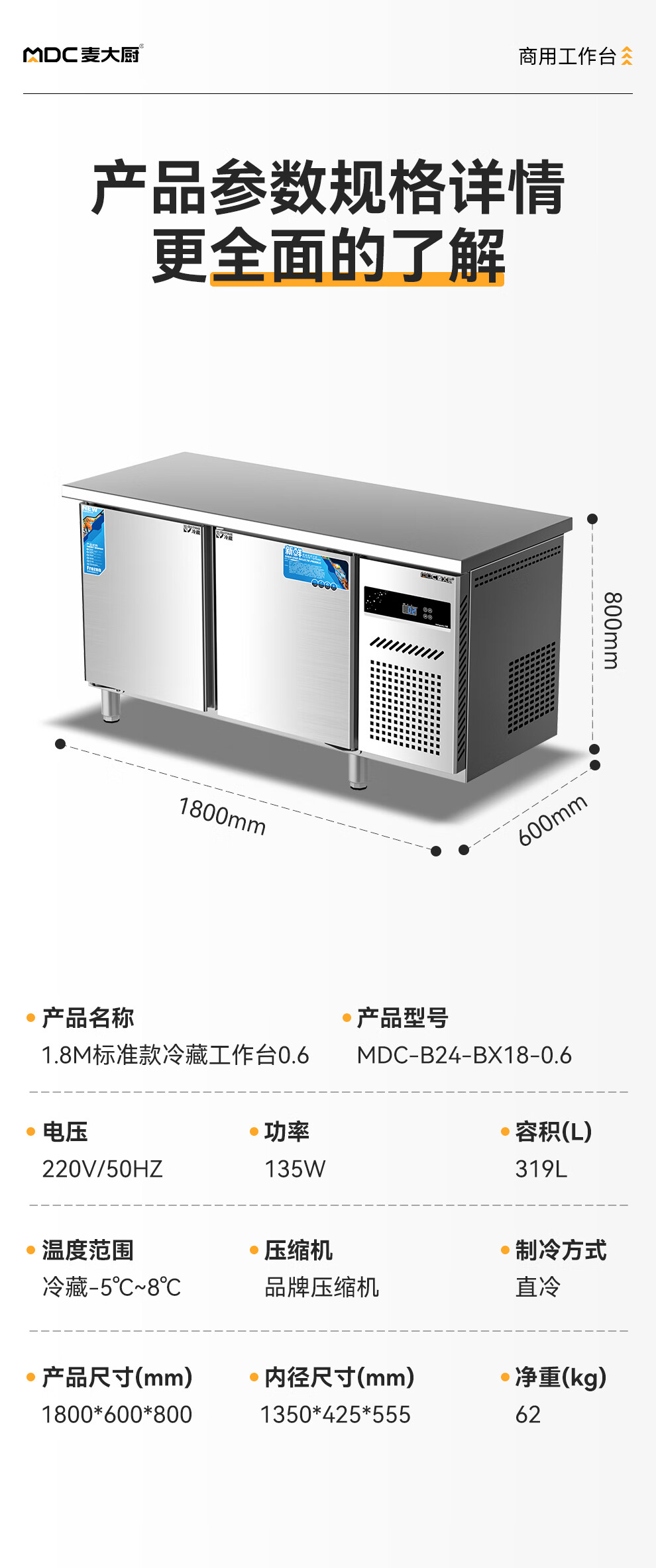 麥大廚1.8M標(biāo)準(zhǔn)款135W直冷冷藏工作臺(tái)0.6