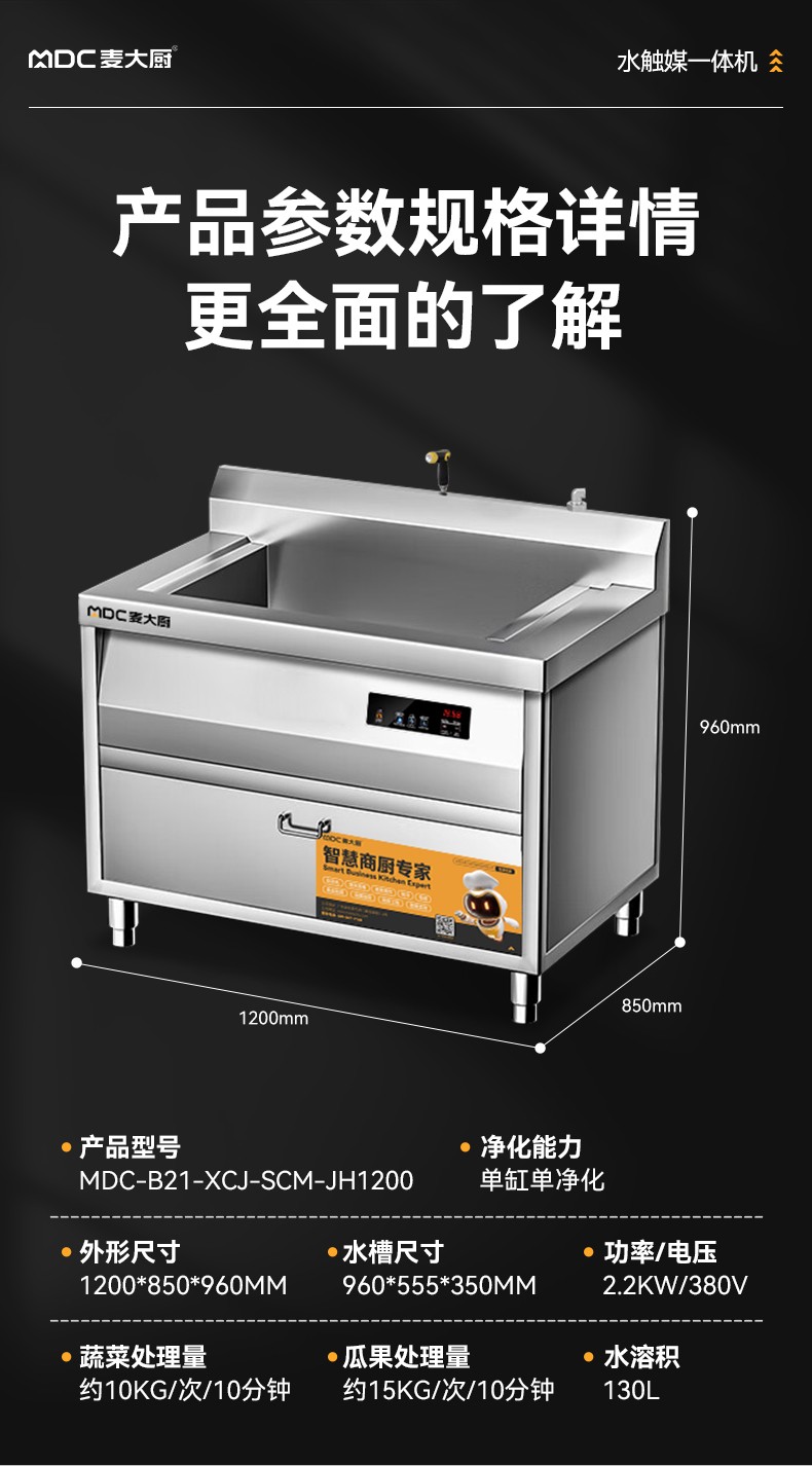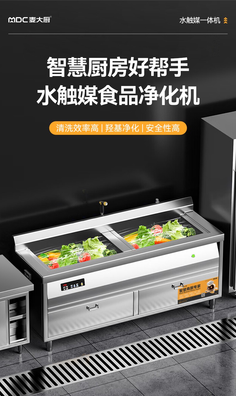 麥大廚1.2米自動商用洗菜機果蔬清洗機單缸水觸媒凈化機